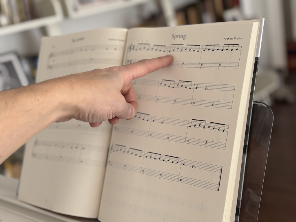 The student plays one hand and uses their other hand to point and follow along in the sheet music.